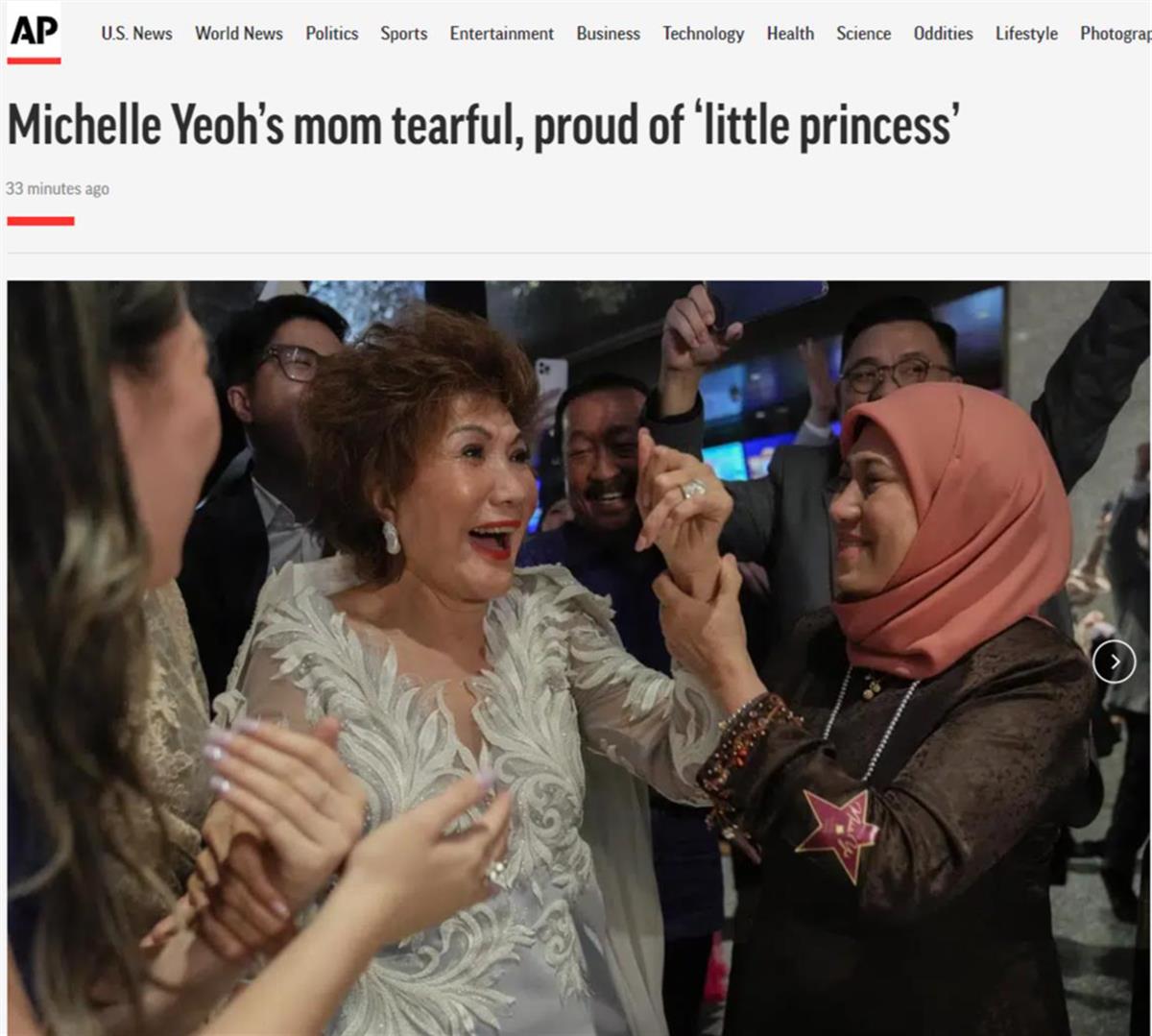 当地时间3月13日,在马来西亚举行的特别奥斯卡颁奖会上,杨紫琼的粉丝为她的获奖欢呼雀跃。杨紫琼的母亲泪流满面,她称赞杨紫琼聪明勤奋,是个孝顺的女儿。“我非常爱我的女儿,她让马来西亚感到骄傲。”“我为‘我的小公主’感到无比自豪。”杨紫琼的母亲说。