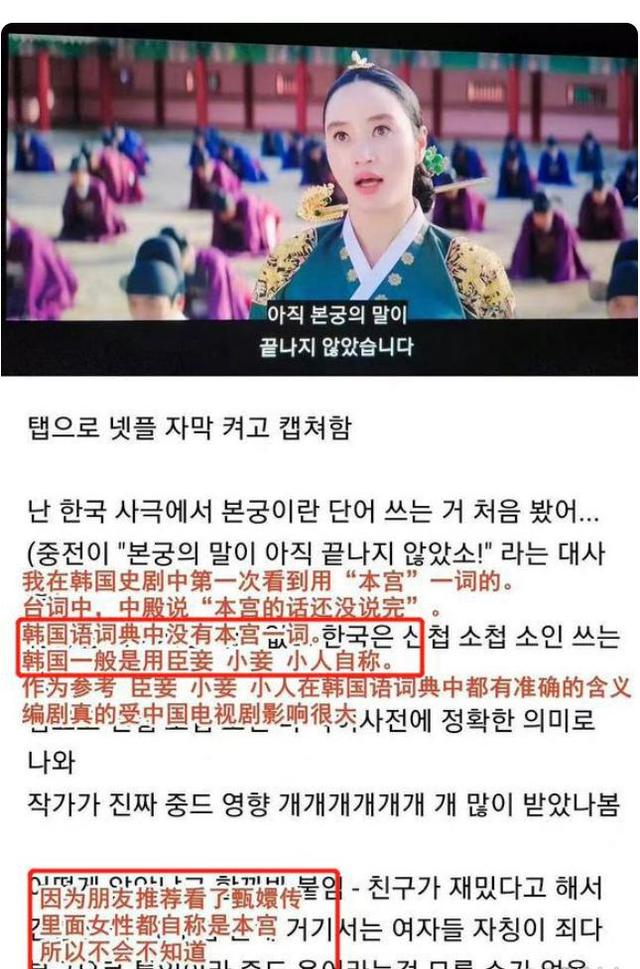还有网友担忧,这样的合作很可能造成我们独有的文化IP流失甚至被“挪用”。有网友还晒出韩国影视剧的截图进行例证:比如韩国去年的热播古装剧《还魂》,就因为剧中服化道有很强烈的中国仙侠剧的即视感,被中国网友质疑“东施效颦”;还有去年韩国的宫斗剧《王后伞下》出现了“本宫”的自称,也被网友质疑是不是受到了国产宫斗剧的影响;此外,另一部韩剧《朝鲜驱魔师》中,也曾因为出现了大量中国元素遭遇韩国观众的不满……