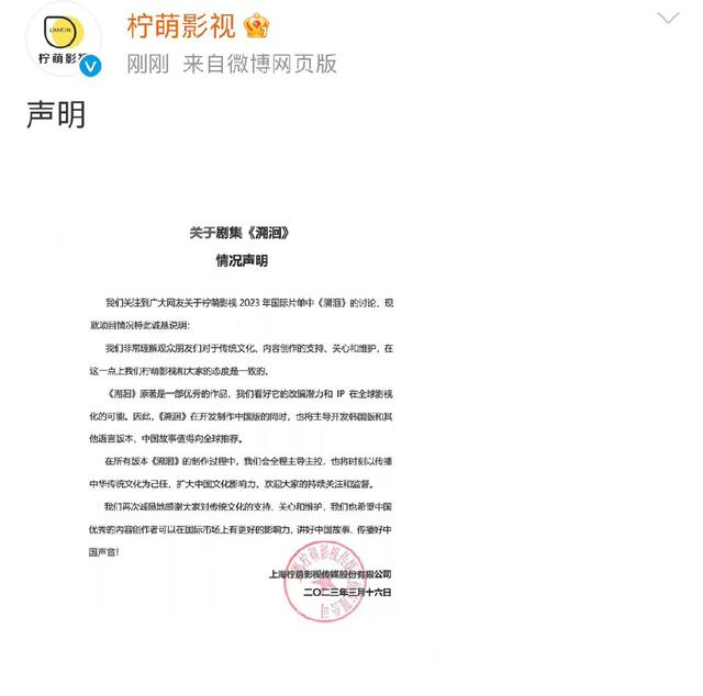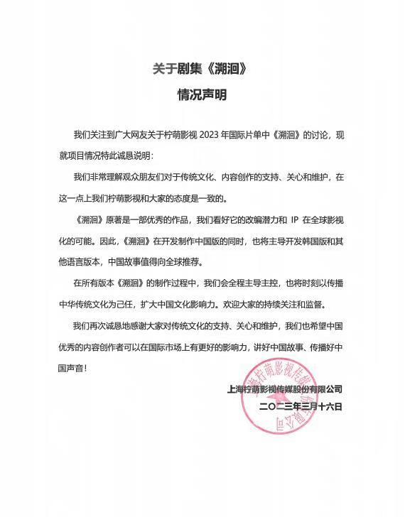 3月16日,柠萌影视发声明回应联合韩国制作团队开发古装剧《溯洄》一事,声明指出,“《溯洄》原著是一部优秀的作品,看好它的改编潜力和IP在全球影视化的可能,柠萌在开发中国版的同时,也将主导开发韩国版和其他语言版本,“中国故事值得向全球推荐。”