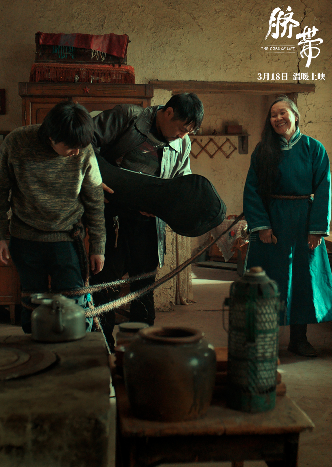“脐带”作为影片最重要的象征物,既是血脉的羁绊,又是母亲的束缚,在蒙古语中有着“脐带”“连接”和“传承”三种语意。影片中最为有趣的一幕之一,是母亲开心地用绳子将两个儿子围起来。“这是演员们的即兴创作。”乔思雪透露,“他们进入了人物的心理状态,自然而然地做出一些下意识的动作,譬如儿子会时常拉绳子、从地上捡起绳子,母亲会绷紧绳子。”