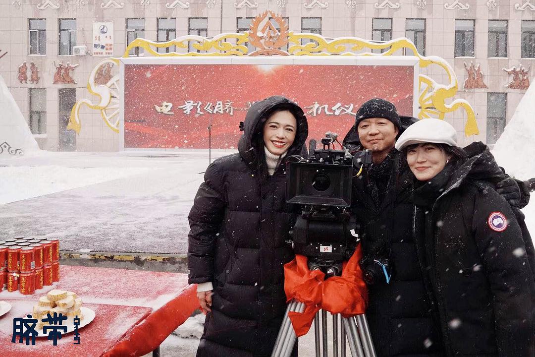 姚晨、曹郁和乔思雪在《脐带》开机现场