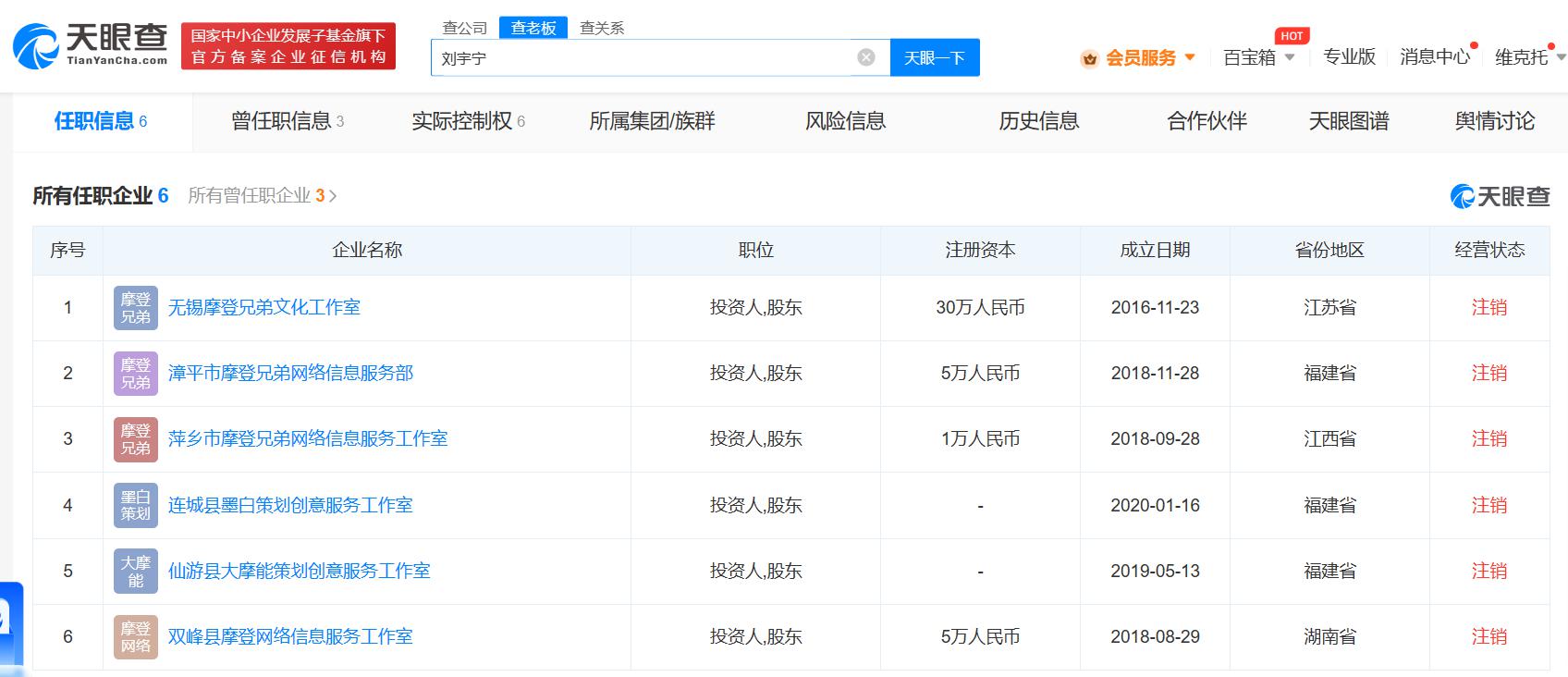 天眼查App显示,刘宇宁共关联6家企业,包括无锡摩登兄弟文化工作室、漳平市摩登兄弟网络信息服务部、萍乡市摩登兄弟网络信息服务工作室等,分布在福建、江苏、江西、湖南四省份,均由刘宇宁个人独资。不过,6家企业目前均已注销。
