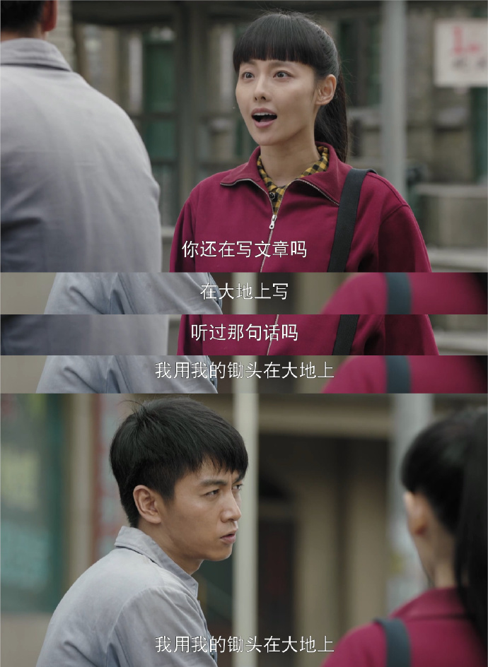 黄亚萍(张嘉倪饰)安慰灰心的高加林(陈晓饰)用锄头在大地上写作