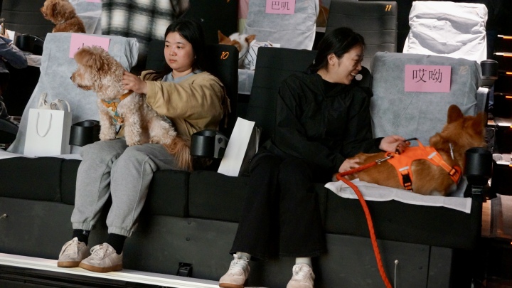 当晚,这30只狗狗按大小被分到了六楼的两个影厅。潮新闻记者发现,影院还为宠物免费提供了尿垫等。有的狗狗坐在椅子上,有的蹲在主人身边,还有的被主人抱在怀里,东张西望,摇着尾巴。