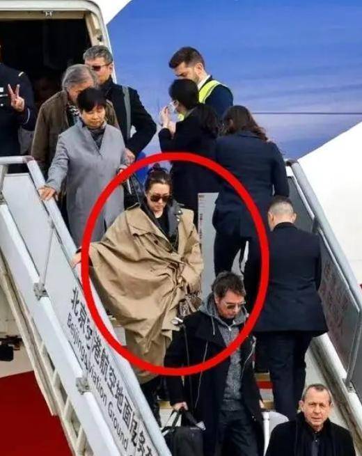 4月5日,巩俐坐着法国总统马克龙的专机抵达北京。她的丈夫让-米歇尔·雅尔走在前面,全程提着行李箱。
