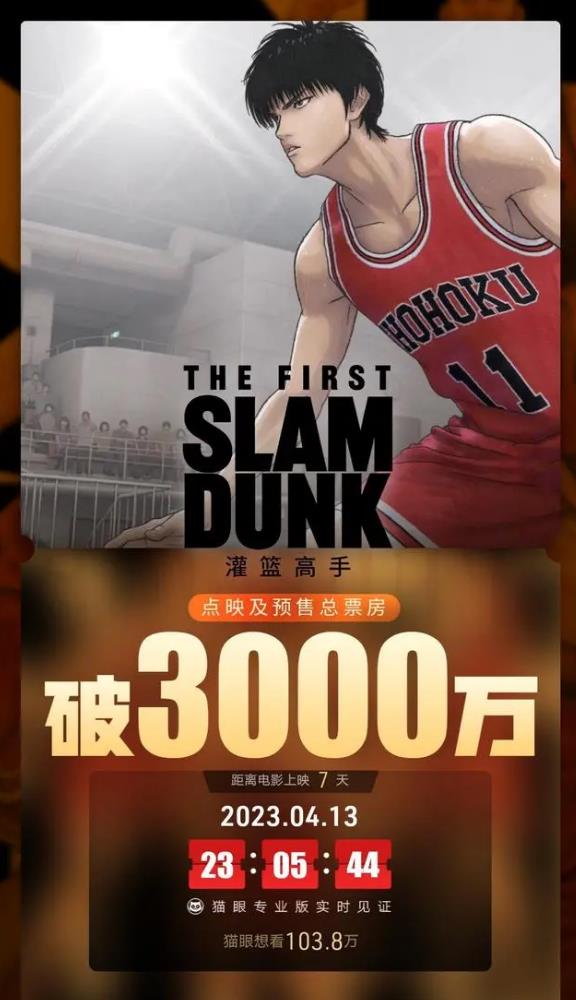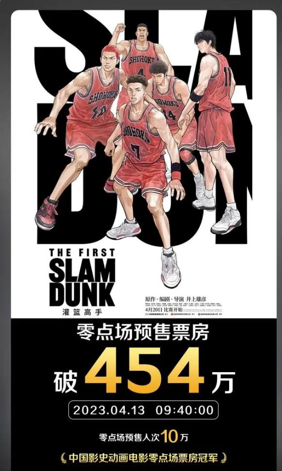 4月13日,据灯塔专业版数据显示,影片《灌篮高手》零点场预售票房突破454万,已超过《小黄人大眼萌》成为中国影史动画片零点场票房冠军。同时,据猫眼专业版数据显示,距离电影上映7天,点映及预售总票房已破3000万,猫眼想看指数103.8万。