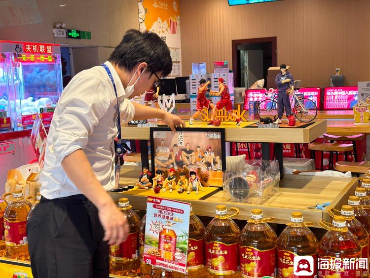 记者看到,关于《灌篮高手》的相关周边商品已经摆上货架,影城工作人员透露也会针对该电影推出送公仔的活动。