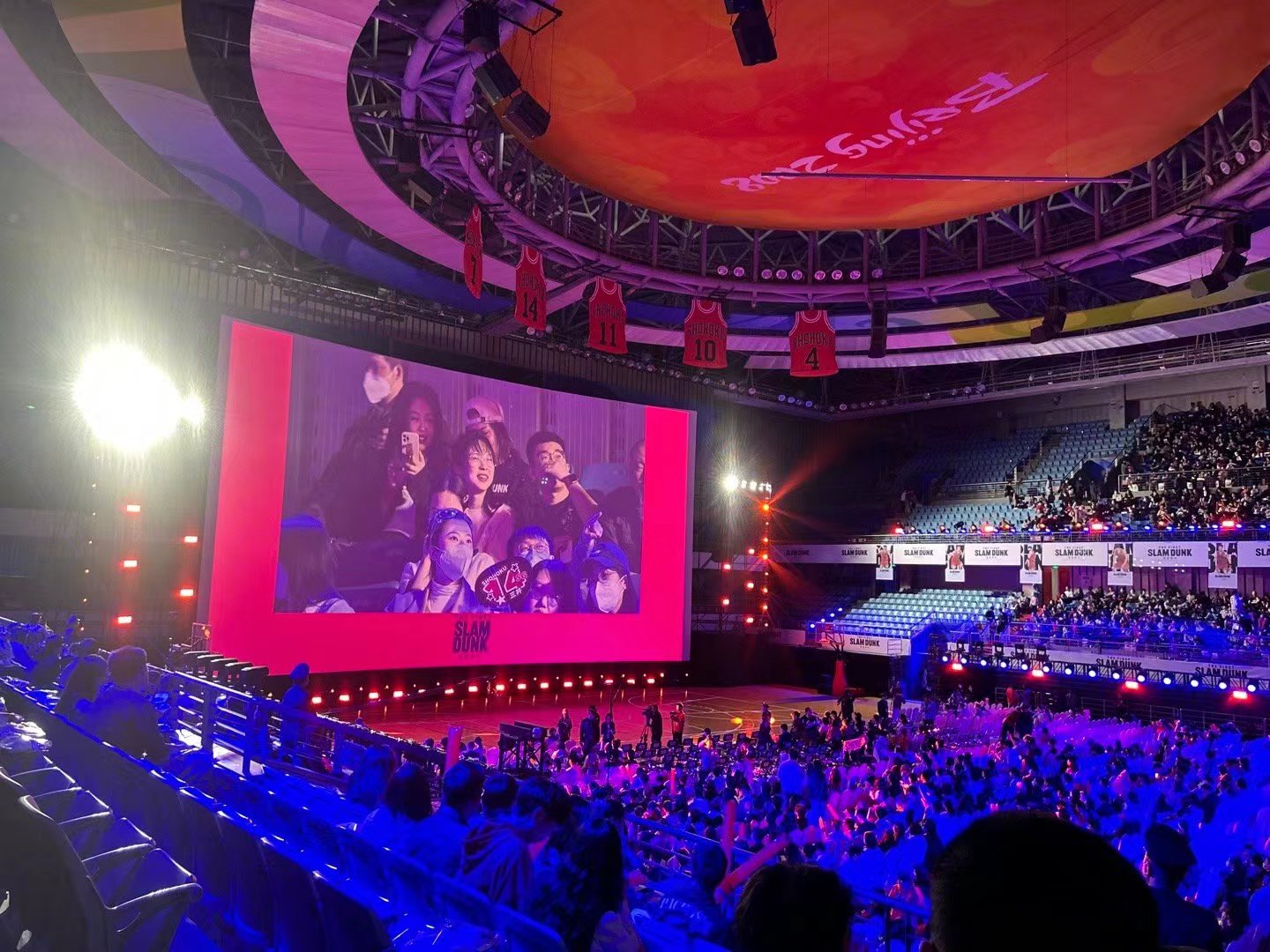 澎湃新闻记者在现场看到,邱德拔体育馆的穹窿正中,至今还悬挂着“Beijing2008”的圆形条幅。那个夏天,这里曾是奥运会乒乓球项目的比赛场地——4月15日下午,数千人围坐在27米高的Cinity巨幕前,为湘北高中篮球队与山王工业的对决呐喊助威。