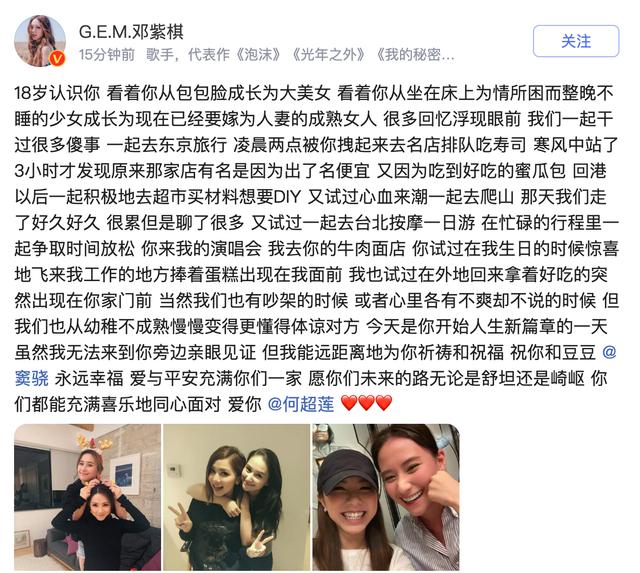 刚刚,邓紫棋发文祝福何超莲:“远距离地为你祈祷和祝福,祝你和豆豆(窦骁)永远幸福”。