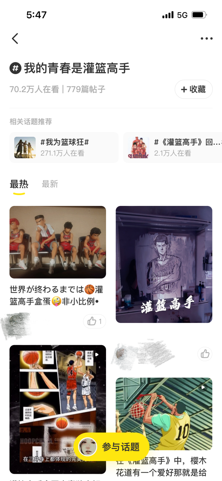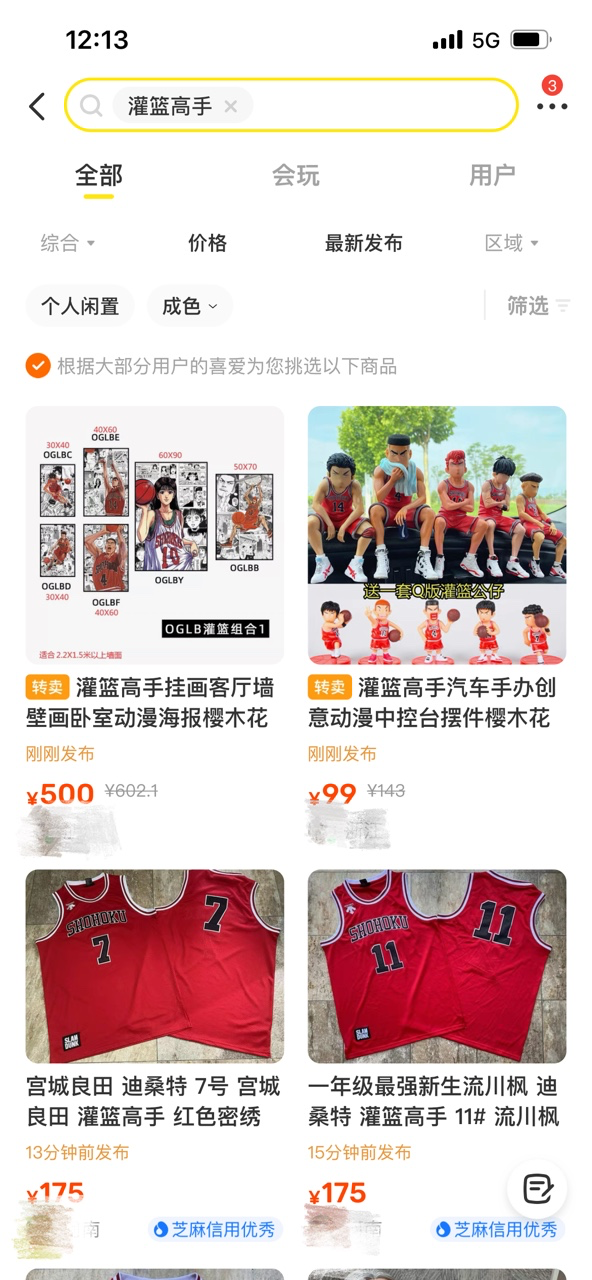 《灌篮高手》电影版上映,相关周边在二手平台也迎来线上交易的高峰。据数据显示,近一周内闲鱼上灌篮高手相关新发商品数量破万件,环比上涨261%。在闲鱼“会玩”板块,#我的青春是灌篮高手#话题引发了近70万用户的关注。