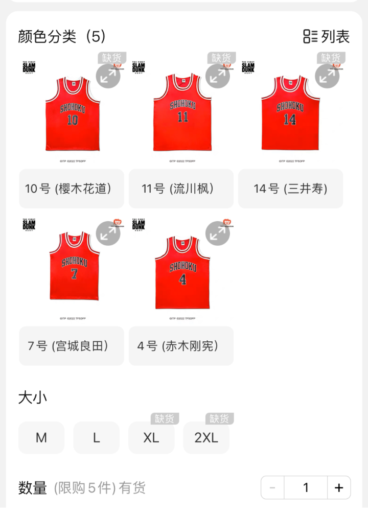上线不到1分钟,湘北运动套装、明信片套装、A4文件夹套装等多款新品率先售罄。在湘北球衣中,10号樱木花道、11号流川枫、14号三井寿的球衣最受欢迎。此外,流川枫、三井寿的手办也出现了部分断货的现象。