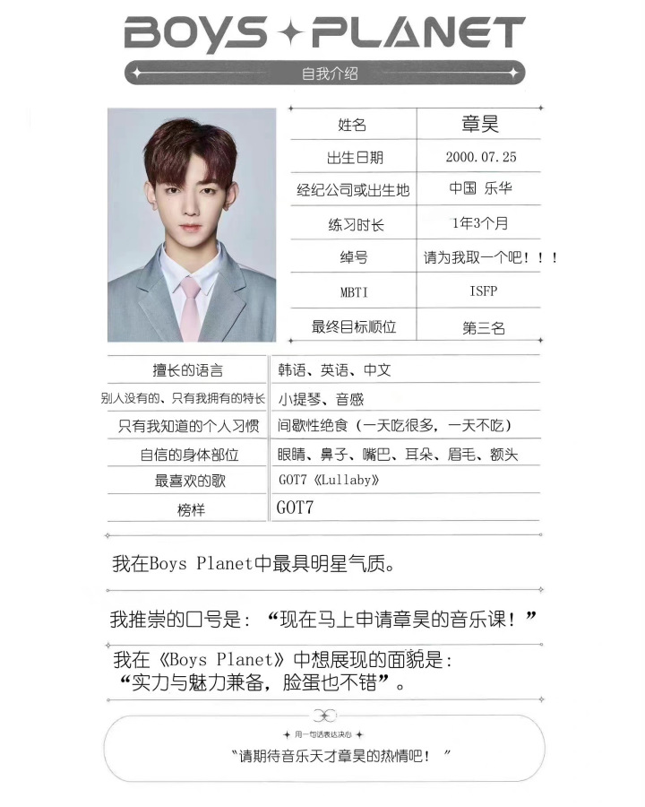 2021年,章昊加入乐华娱乐公司,成为旗下练习生。在训练一年零3个月后,他加入选秀节目《BOYSPLANET》。