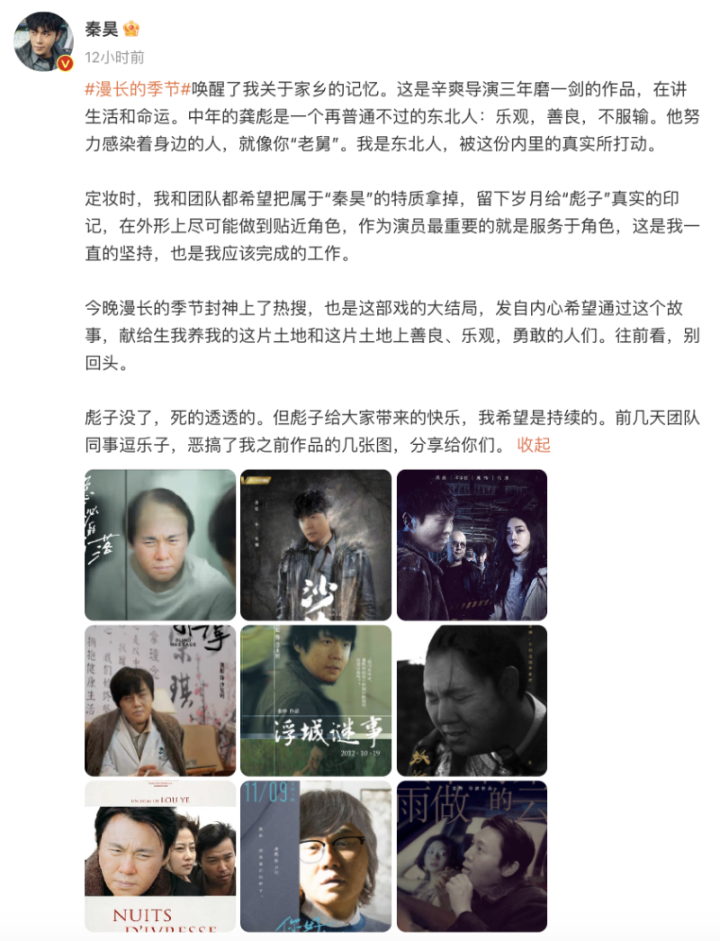 秦昊在告别角色的长文中表示,“定妆时,我和团队都希望把属于‘秦昊’的特质拿掉,留下岁月给‘彪子’真实的印记,在外形上尽可能做到贴近角色,作为演员最重要的就是服务于角色,这是我一直的坚持,也是我应该完成的工作。今晚漫长的季节封神上了热搜,也是这部戏的大结局,发自内心希望通过这个故事,献给生我养我的这片土地和这片土地上善良、乐观、勇敢的人们。往前看,别回头。彪子没了,死的透透的。但彪子给大家带来的快乐,我希望是持续的。”