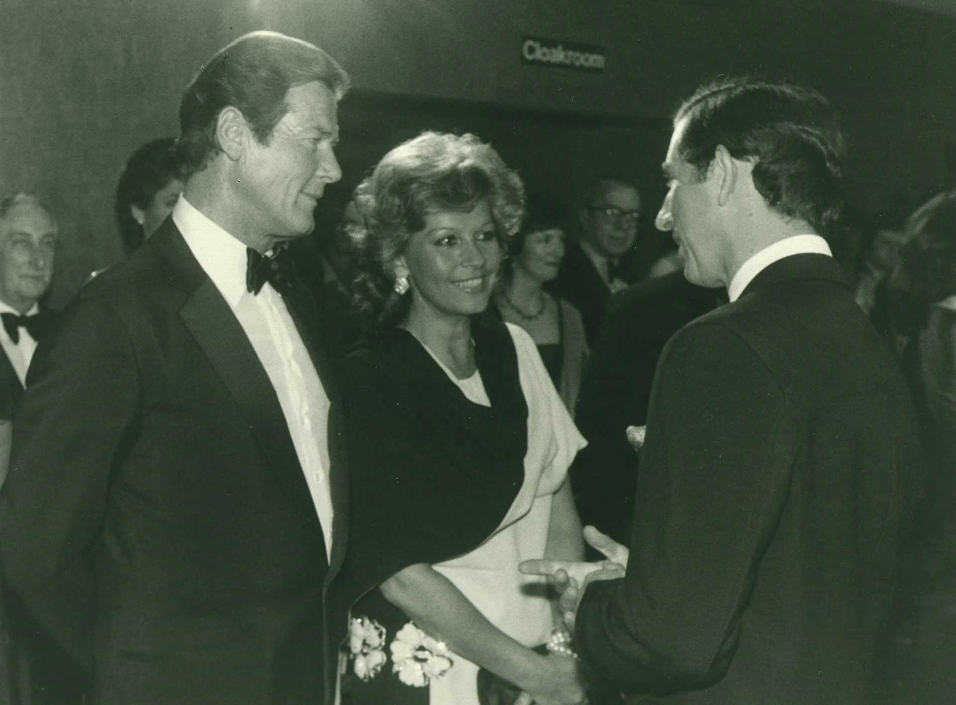 1977年,当时还是王子的查尔斯在《海底城》首映礼上同罗杰·摩尔等主创握手交谈