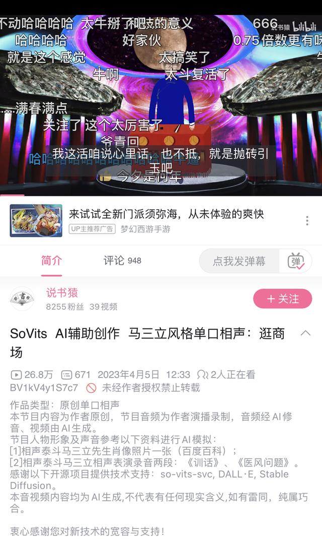 除了“AI孙燕姿”“AI周杰伦”“AI陈奕迅”等知名当红歌手之外,还有网友自行训练了邓丽君、黄家驹、姚贝娜等已故歌手的声音模型,通过AI合成语音让歌迷再次听到久违的声音。甚至还有网友将元宇宙概念与AI合成语音相结合,制作了马三立单口相声。据创作者介绍,视频由马三立先生的一张照片AI生成,音频是由马三立先生相声表演《训话》、《医风问题》两段录音,经AI修音生成。不少网友在评论区留言“这口头禅、这停顿,已经完全是本人了,听着听着就流泪,没想过有生之年还能再听到老先生的新活。”