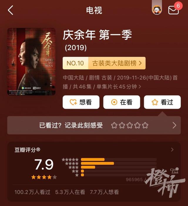 2019年,根据猫腻同名小说改编的电视剧《庆余年》,集结了张若昀、陈道明、吴刚、李小冉、辛芷蕾、李纯、宋轶等老中青三代演员,在腾讯和爱奇艺首播,上线仅五天收视点击就突破3亿!2020年,《庆余年》在中国香港地区上星播出后,平均收视达到26.1点,最高收视28.7点,直接打破了TVB自2016年以来的二线剧集首播收视纪录。