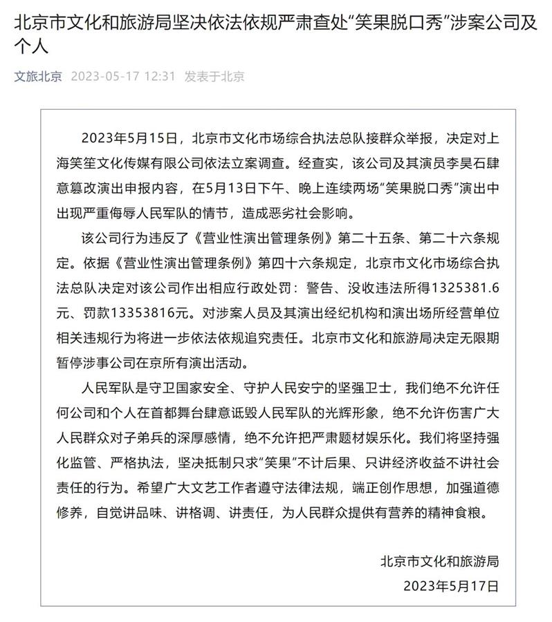 5月17日12时31分,针对近期脱口秀演员House在演出中发表的不恰当言论问题,“文旅北京”公众号发布文章,表示将依法依规严肃查处“笑果脱口秀”涉案公司及个人。文中提到,因House的脱口秀言论中出现“严重侮辱人民军队的情节”,北京市文化市场综合执法总队将依据《营业性演出管理条例》第46条规定,没收此次“笑果脱口秀”的“违法所得”共计1325381.6元,同时处以罚款13353816元。