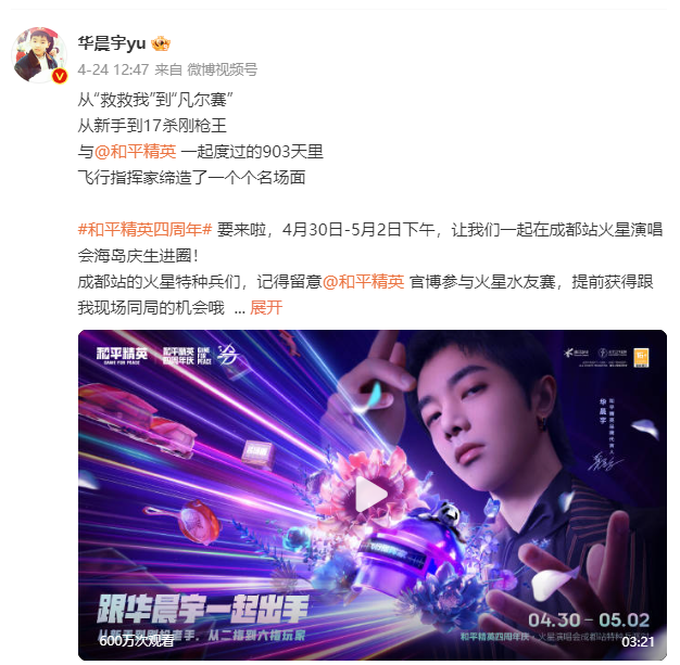 据记者了解,华晨宇不仅是《和平精英》的品牌代言人,自己也是该游戏的忠实玩家,在近日和平精英亚运版国家队集训名单出炉时,他还录制了相关打call视频应援。