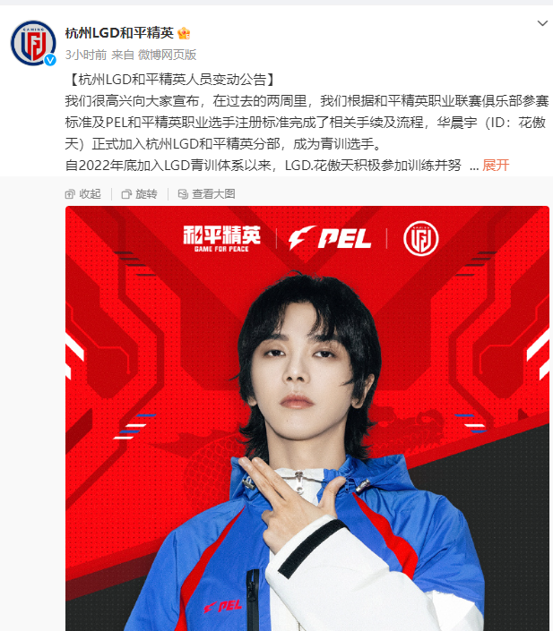 据LGD公告显示,自2022年底加入LGD青训体系以来,华晨宇就积极参加训练并努力提升竞技水平,在过去的两周里,根据和平精英职业联赛俱乐部参赛标准及PEL和平精英职业选手注册标准完成了相关手续及流程,华晨宇(ID:花傲天)正式加入杭州LGD和平精英分部,成为青训选手。