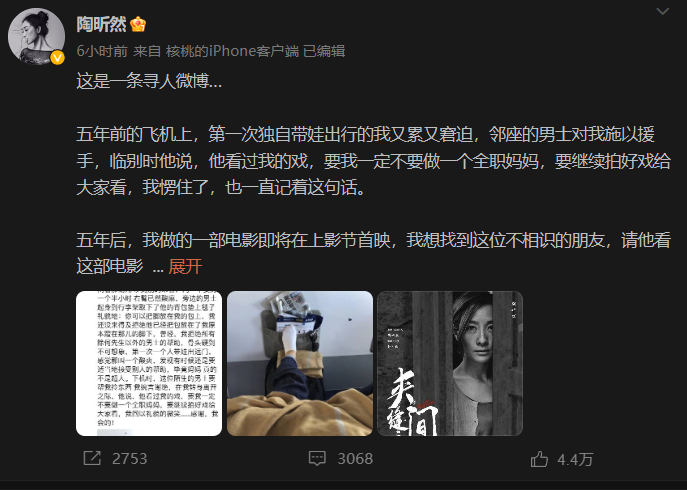 5月30日,演员陶昕然在社交媒体发文称,自己担任出品人、主演的影片《夹缝之间》即将在上海电影节首映,想寻找在五年前她带娃出行时鼓励她要好好拍戏的邻座男士,邀请其看电影。