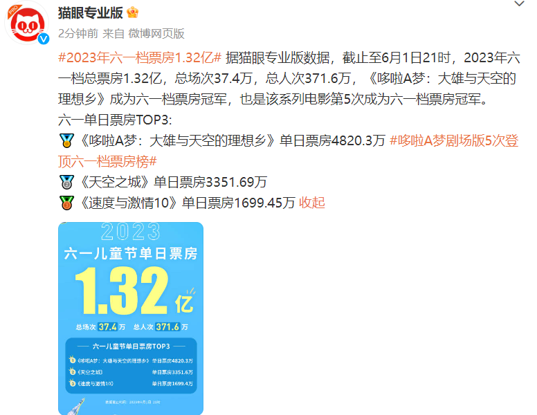 六一单日票房TOP3:《哆啦A梦:大雄与天空的理想乡》单日票房4820.3万,《天空之城》单日票房3351.69万,《速度与激情10》单日票房1699.45万。