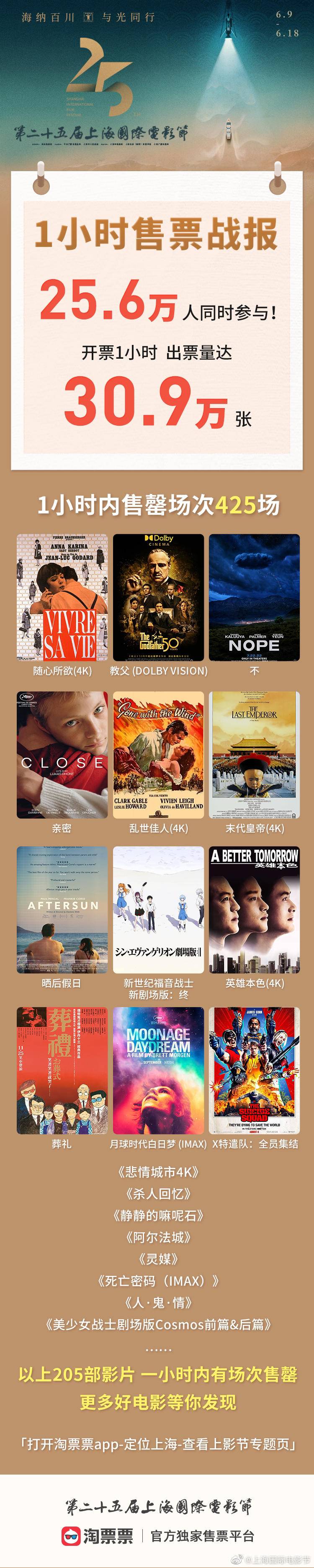 今天12点,第25届上海国际电影节开启网络售票。据其官方微博消息,开票1小时,25.6万人同时参与,出票量达30.9万张。多部热门影片开售即罄,1小时内售罄425场。
