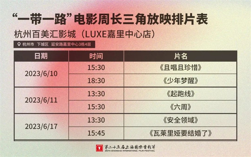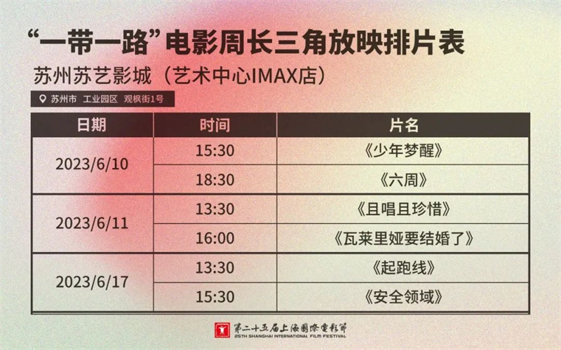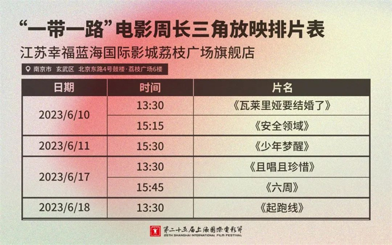 记者注意到,本次长三角放映包含《瓦莱里娅要结婚了》《安全领域》《少年梦醒》《且唱且珍惜》《六周》《起跑线》6部影片。其中江苏共有两家影院参与放映,分别是南京的幸福蓝海国际影城荔枝广场旗舰店、苏州的苏艺影城(艺术中心IMAX店)。