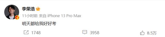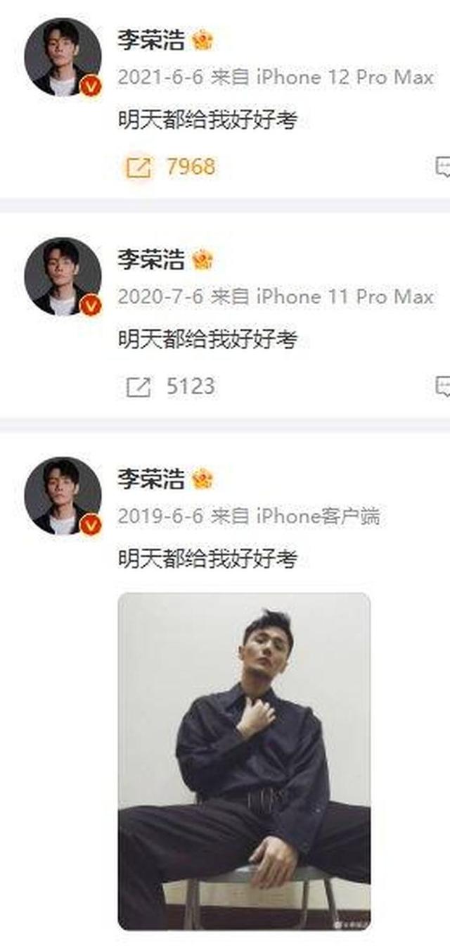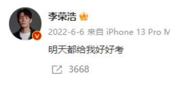6月6日,李荣浩在社交平台上发布了一则祝福考生的文案:“明天都给我好好考。”