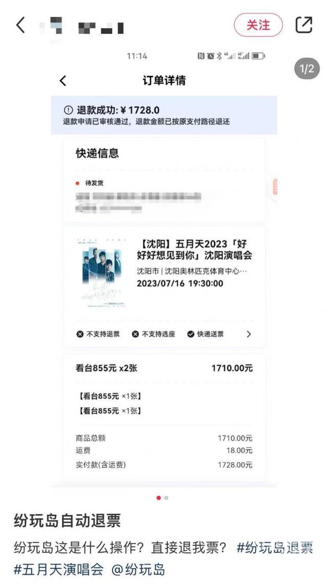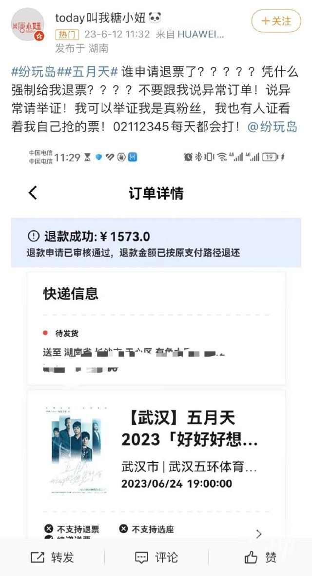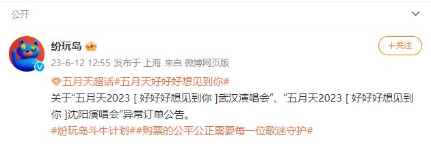 对于网友反映出来的退票问题,演唱会主办方纷玩岛在官微做出了回应,发布了关于“五月天2023[好好好想见到你]武汉演唱会”“五月天2023[好好好想见到你]沈阳演唱会”异常订单的公告。