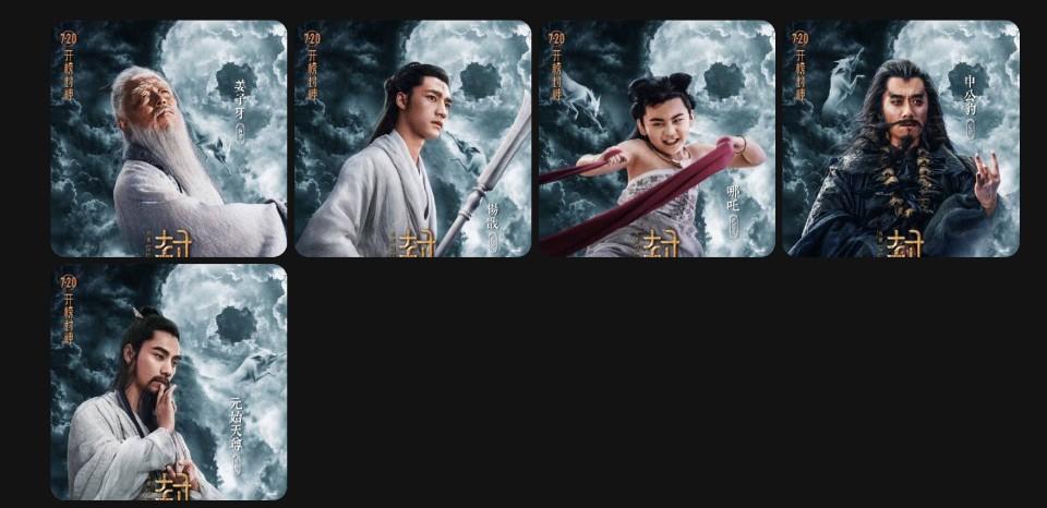 《封神第一部》仙界角色海报包括姜子牙(黄渤饰)、杨戬(此沙饰)、哪吒(武亚凡饰)、申公豹(夏雨饰)、元始天尊(陈坤饰)几位昆仑山仙人。