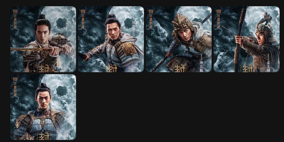 电影《封神第一部》质子旅角色海报,截取了片中姬发(于适饰)、殷郊(陈牧驰饰)、崇应彪(侯雯元饰)、姜文焕(黄曦彦饰)、鄂顺(李昀锐饰)五位质子角色的战斗瞬间。