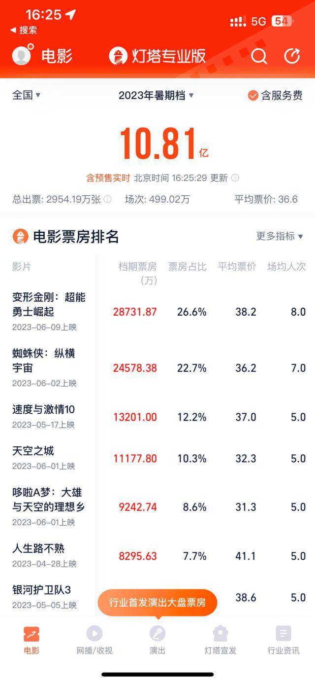 根据灯塔专业版数据,截止6月11日下午3点,2023年暑期档(6月1日-8月31日)国内的总票房突破了10亿元。