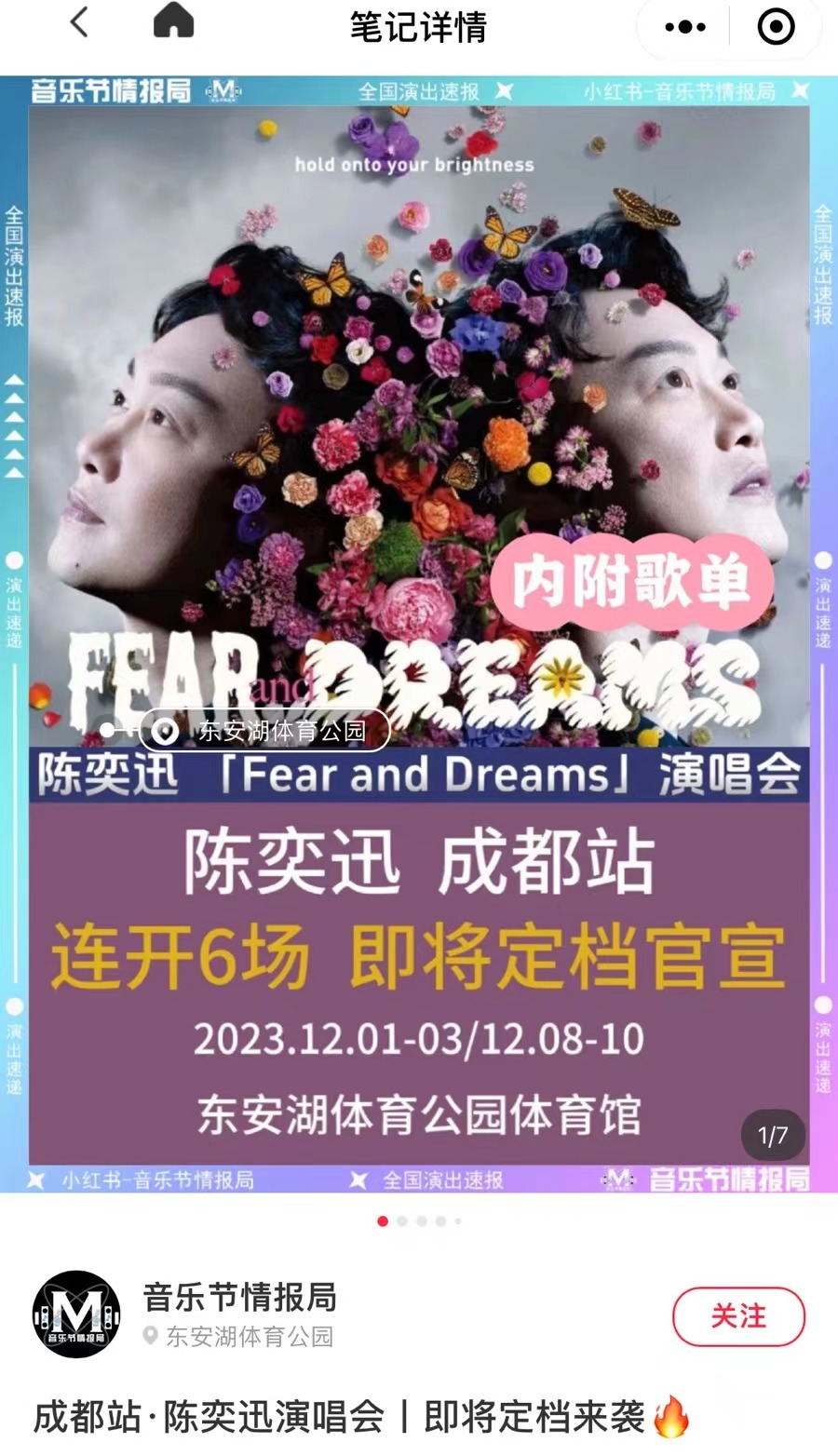 今(5)日,有音乐博主发文透露,歌手陈奕迅将在12月的成都,举办6场演唱会,地点选在了东安湖体育公园体育馆,并表示“即将定档官宣”,还附上了一份包括《兄妹》《红玫瑰》《好久不见》《十年》等歌曲在内的演唱会歌单。
