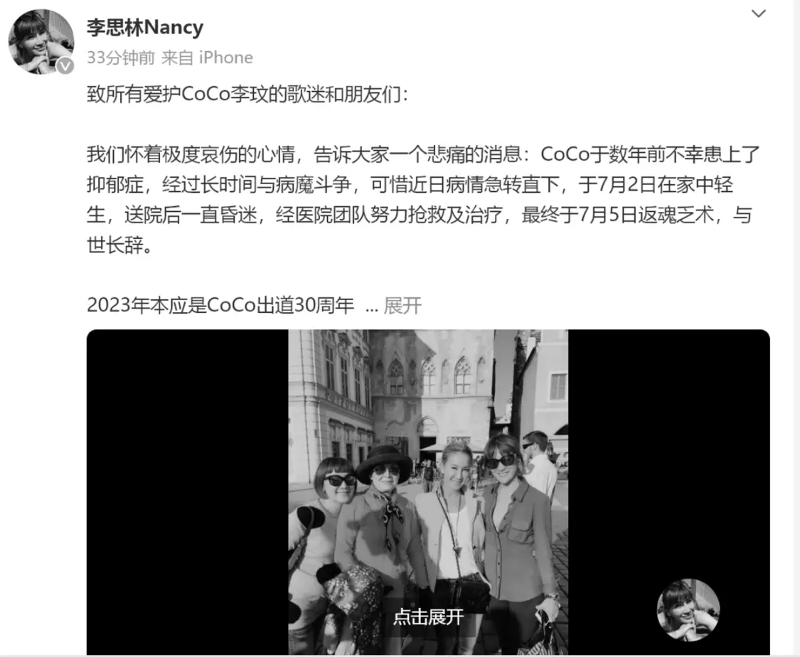 7月5日晚,CoCo李玟的姐姐李思林在微博发长文表示,李玟因抑郁症在家中轻生,经抢救无效,于7月5日与世长辞。