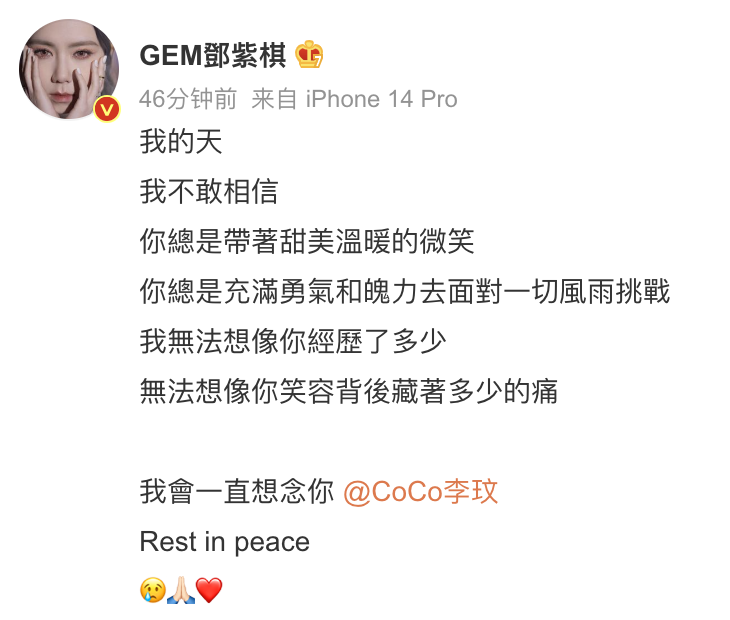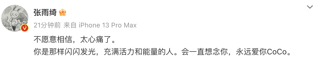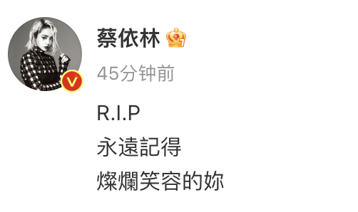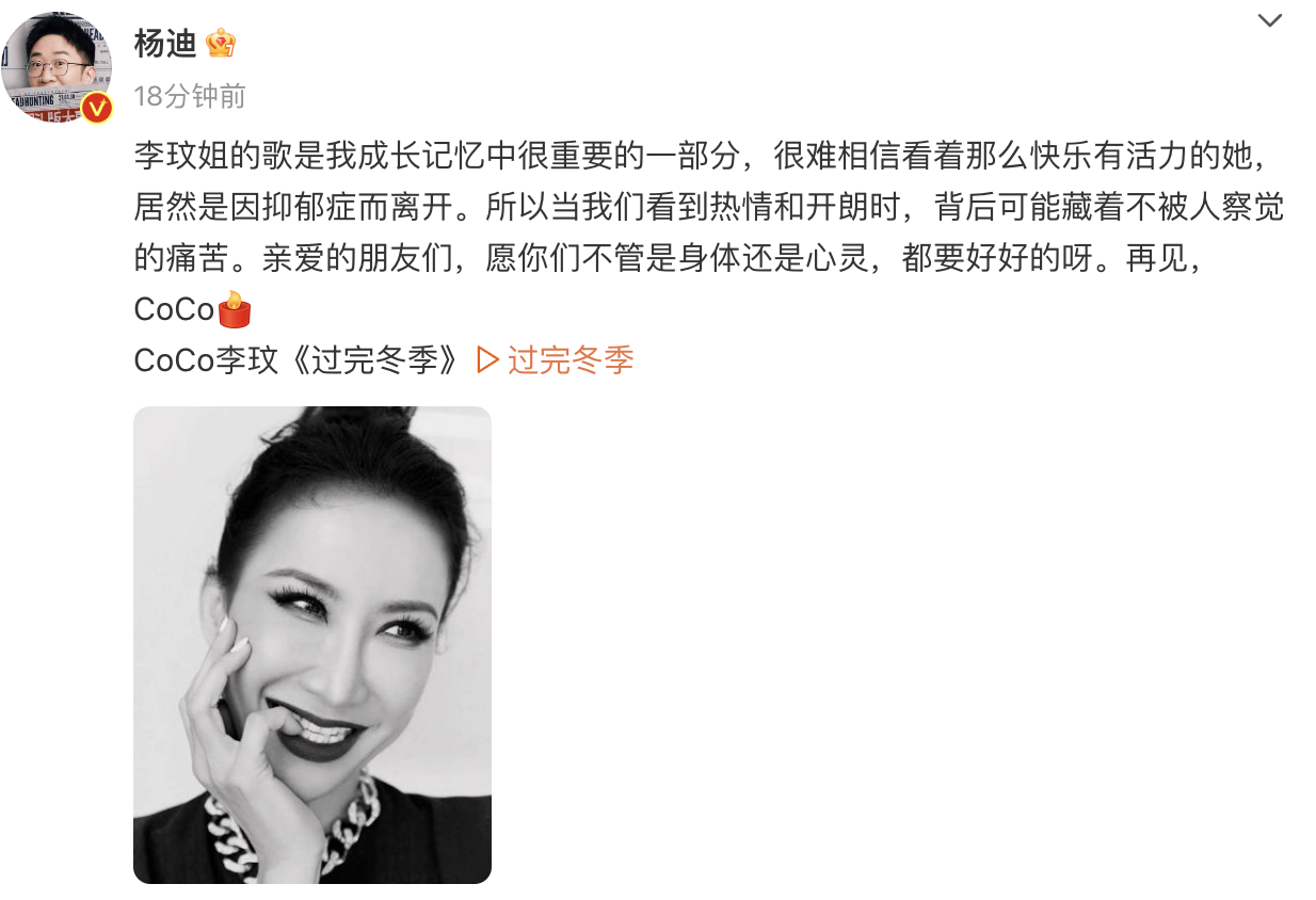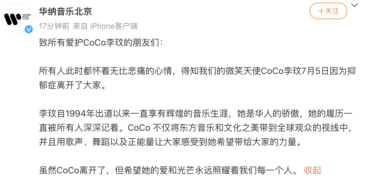 李玟的音乐代理公司华纳音乐通过微博确认了这一噩耗并表示悼念。