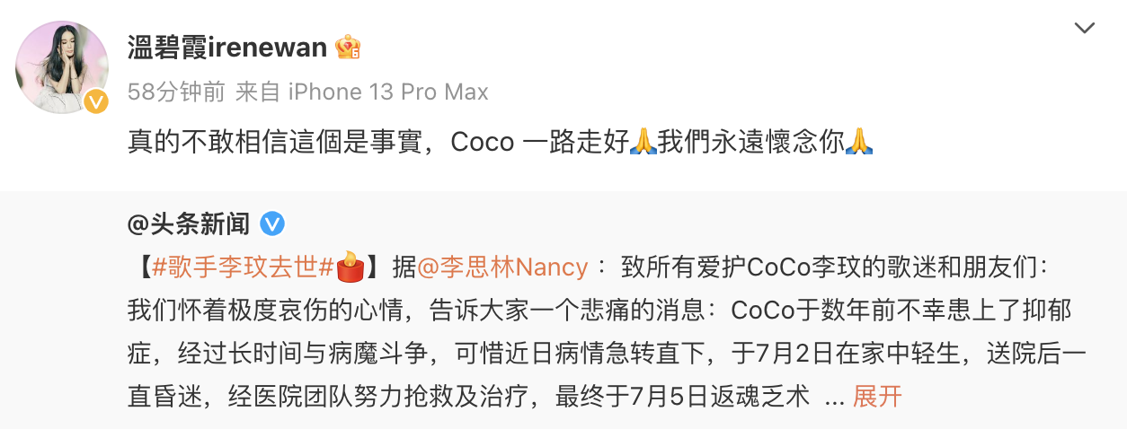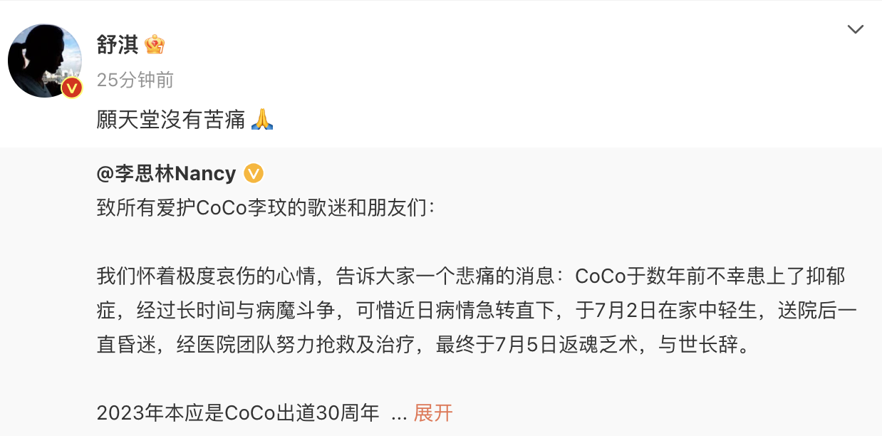 今日,李玟姐姐李思林Nancy公布了李玟7月2日因抑郁症在家中轻生,于2023年7月5日经抢救无效去世的消息。