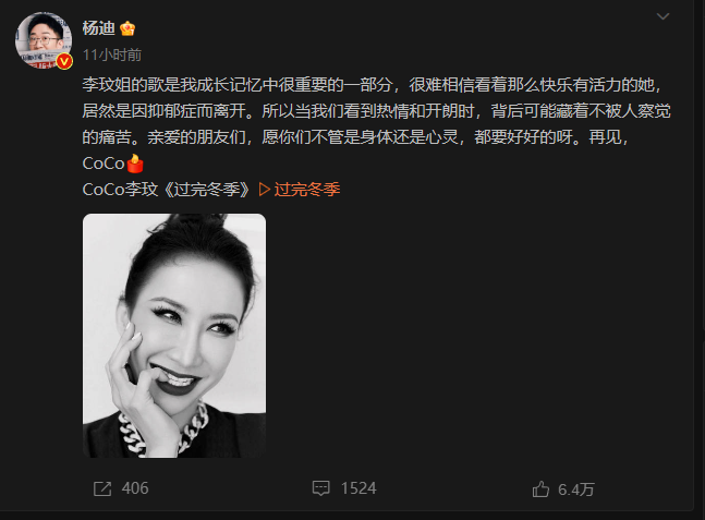 演员杨迪发文悼念:“李玟姐的歌是我成长记忆中很重要的一部分,很难相信看着那么快乐有活力的她,居然是因抑郁症而离开。所以当我们看到热情和开朗时,背后可能藏着不被人察觉的痛苦。亲爱的朋友们,愿你们不管是身体还是心灵,都要好好的呀。再见,CoCo。”