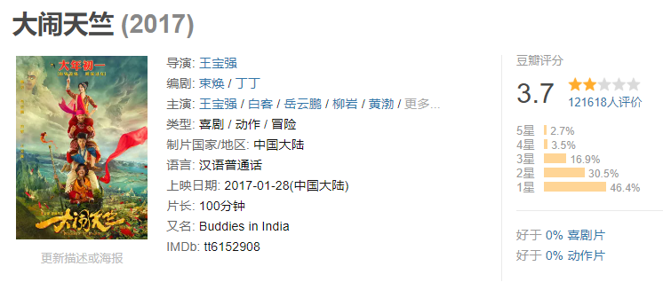 王宝强导演的《大闹天竺》目前豆瓣评分为3.7分