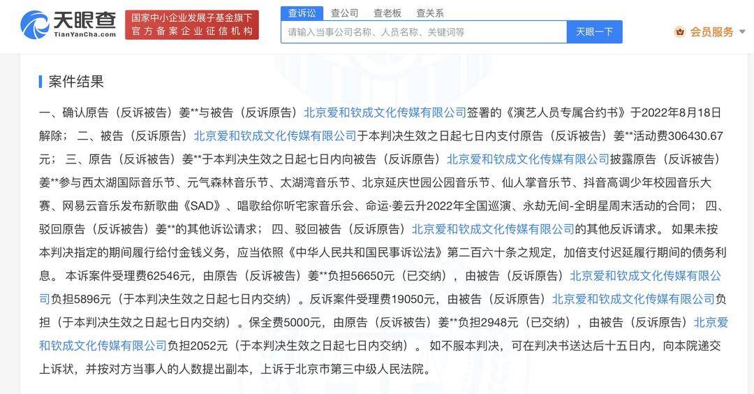 7月7日,根据天眼查公开消息,日前,说唱歌手、音乐人姜云升(本名姜振乾)与北京爱和钦成文化传媒有限公司合同纠纷一审判决书公开。文书显示,原告姜振乾诉称,其与被告爱和钦成公司曾签订演艺人员专属合约书,后双方签订解约协议,约定由姜云升支付600万元及36万元经济成本作为解约金。原告支付解约金后,被告并未将直播签约金、剩余合同款支付给原告,违反解约协议约定。被告爱和钦成公司反诉称,原告未足额支付解约金,且将音乐版权授权给其他平台,解约协议并未履行完毕,要求原告支付剩余解约金,并不得再使用艺名姜云升等。