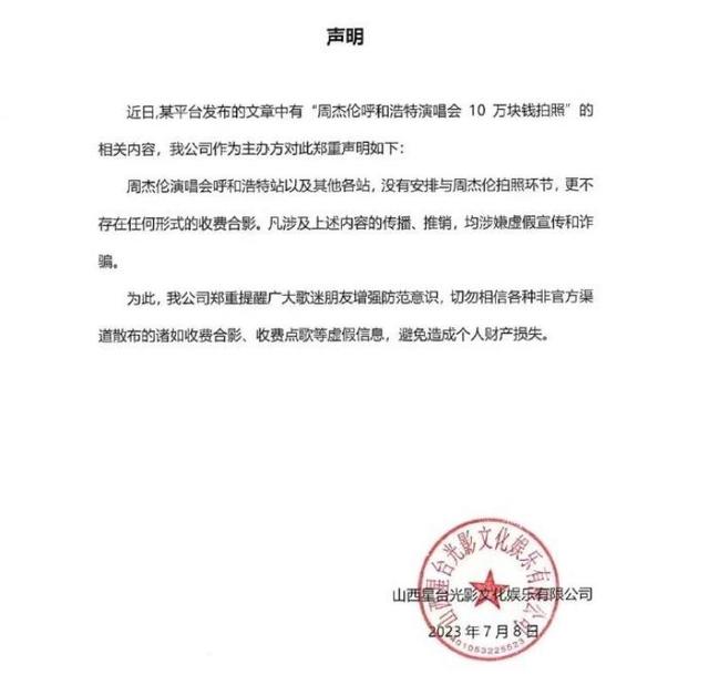 周杰伦的演唱会这么“吸金”吗?近日,又有网络平台发布文章中提及有“周杰伦呼和浩特演唱会10万块钱拍照”等内容。7月8日,周杰伦演唱会主办方发布声明:“周杰伦演唱会呼和浩特站以及其他各站没有安排与周杰伦拍照环节,更不存在任何形式的收费合影,上述内容的传播、推销均涉嫌虚假宣传和诈骗。”