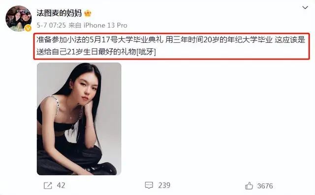 今年5月7日,法图麦·李的母亲哈文也微博发文透露女儿大学毕业的好消息,并表示这是“女儿送给自己21岁生日最好的礼物。”同月的18日,法图麦·李自己也发文称,自己是提前一年大学毕业,并直言自己很开心。