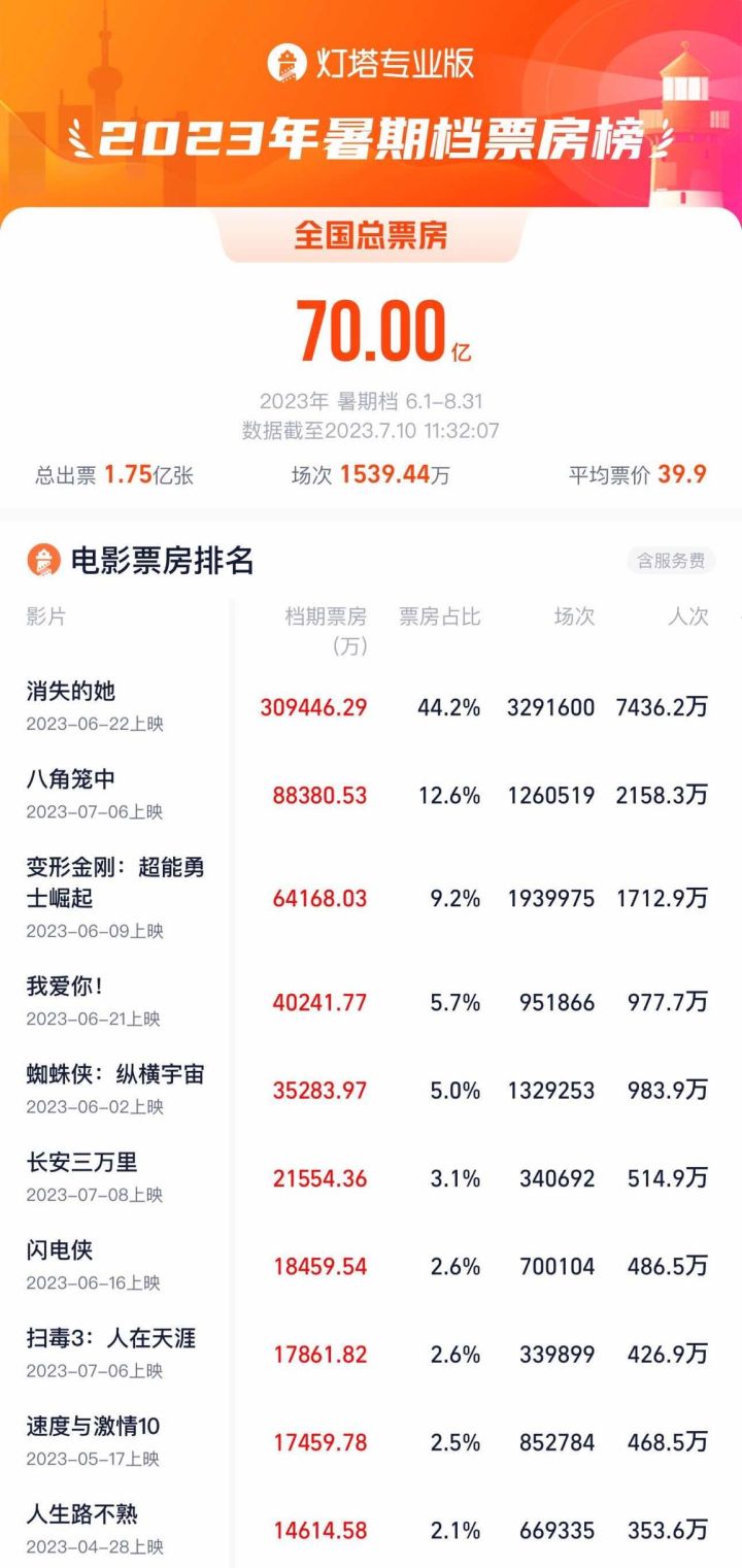 据灯塔专业版实时数据,截至7月10日11时32分,2023年暑期档(6月1日-8月31日)总票房(含预售)突破70亿,《消失的她》《八角笼中》《变形金刚:超能勇士崛起》暂列暑期档票房前三位。