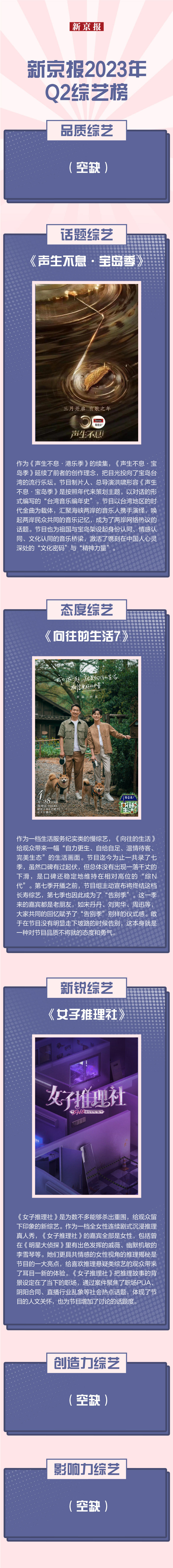 新京报梳理了2023年3月至5月期间开播的热门综艺节目,根据节目质量、内容导向、观众口碑、播出热度等维度,评选出“新京报2023年Q2综艺榜”。