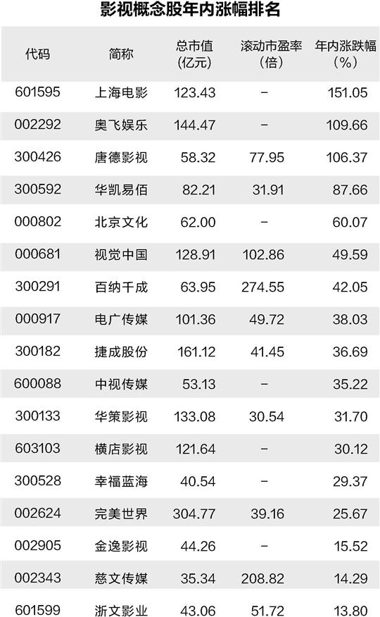A股中影视概念股有30余只。从年内股价表现来看,影视概念股年内平均上涨29.14%,大幅度跑赢大盘,其中上海电影、奥飞娱乐、唐德影视年内涨幅均超100%。相比之下,*ST美盛、博纳影业表现不佳,年内股价分别下跌48.94%和22.95%。