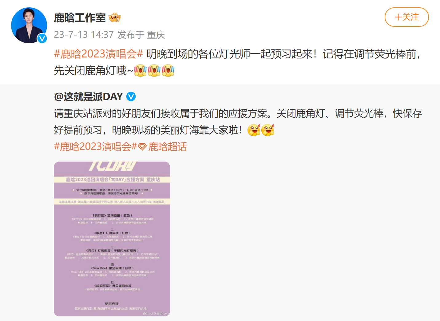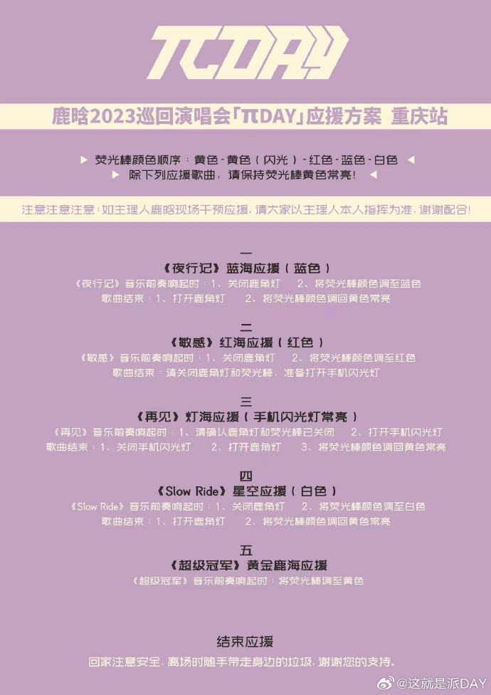 7月13日,鹿晗2023巡回演唱会官方微博“这就是派DAY”发布7月14日重庆站演唱会应援方案:请重庆站派对的好朋友们接收属于我们的应援方案。关闭鹿角灯、调节荧光棒,快保存好提前预习,明晚现场的美丽灯海靠大家啦!