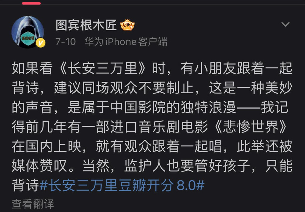 影片上映后,影评人@图宾根木匠发表微博表示,“如果有小朋友跟着一起背诗,建议同场观众不要制止,这是一种美妙的声音,是属于中国影院的独特浪漫。”