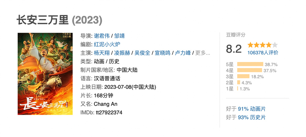 这种独特的观影现象与《长安三万里》广泛的受众构成有关。通常一部动画电影,都会有明确的受众年龄段划分,大多数面向亲子合家欢题材的动画偏低幼,并不会吸引成年观众单独或结伴观看,同年龄层形成的共通的观影化学反应,其实是一种喜闻乐见的“磁场”,不少低幼向的动画甚至会专门将“互动性”作为影片的卖点之一大力宣扬和鼓励。即便近年来有一些非低幼向的动画,受众也多集中在青年和成长主题。