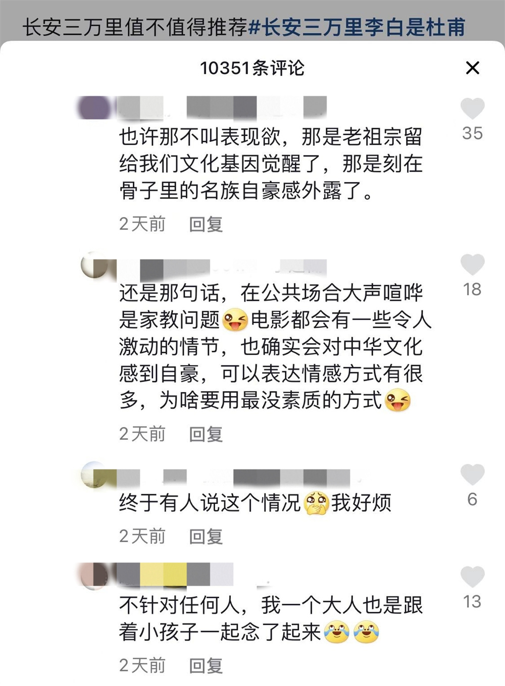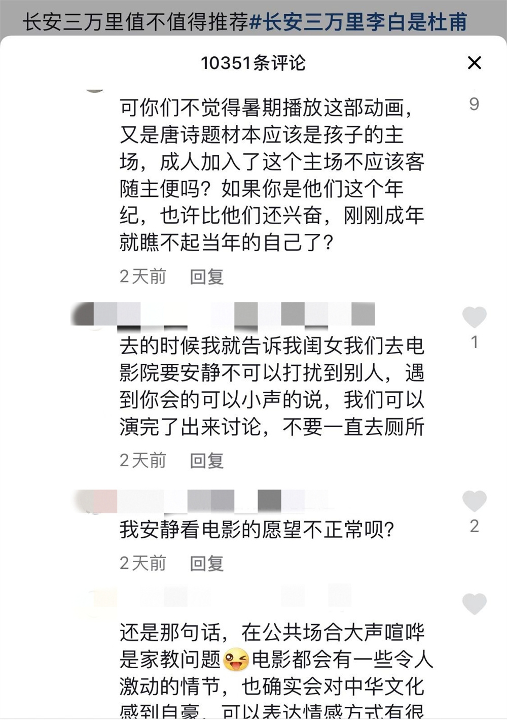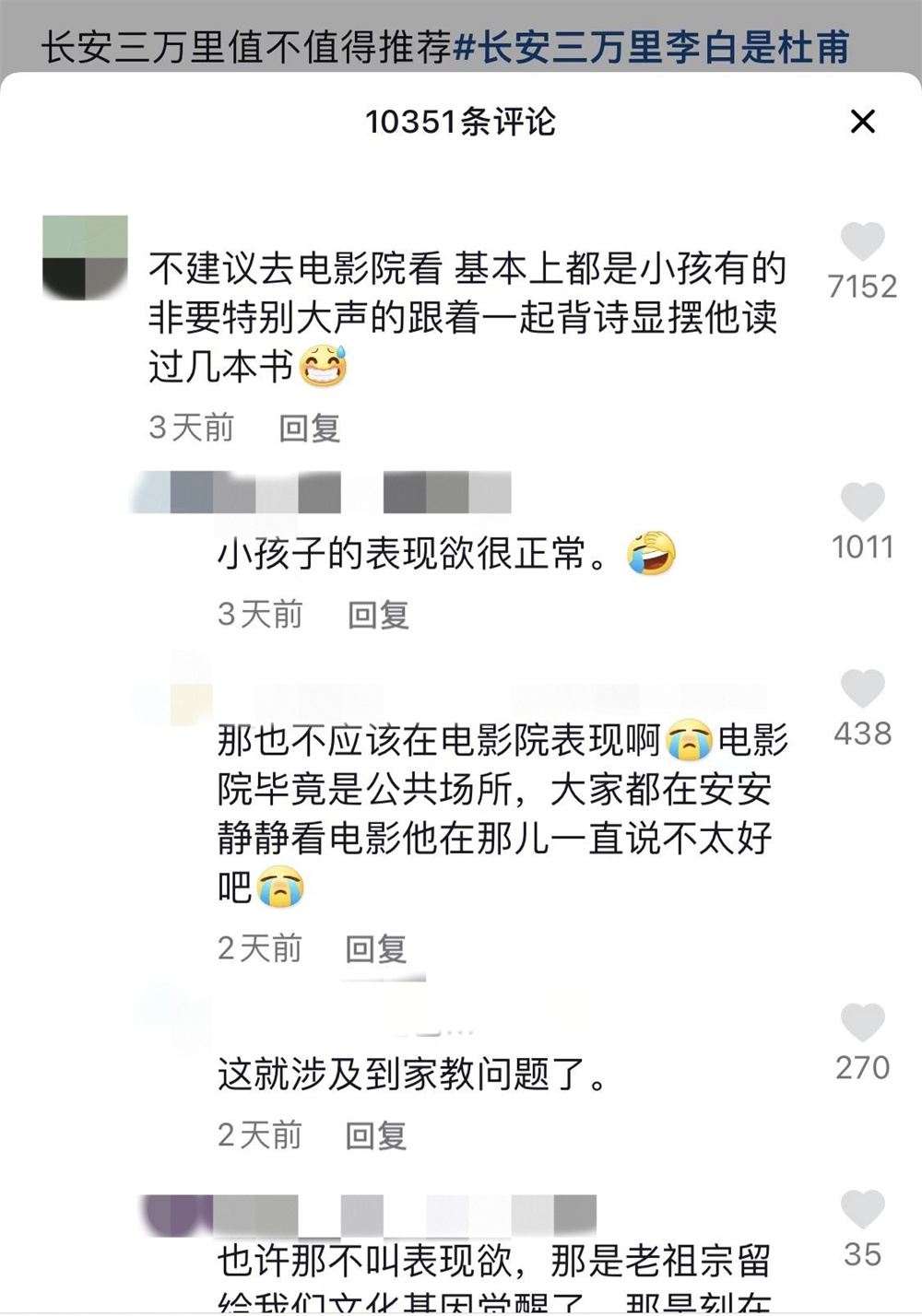 在抖音上,大v一本正经评述电影的下方留言讨论区里,网友为孩子是否应该在影院大声背诗喧哗影响其他观众唇枪舌剑的讨论也是络绎不绝。