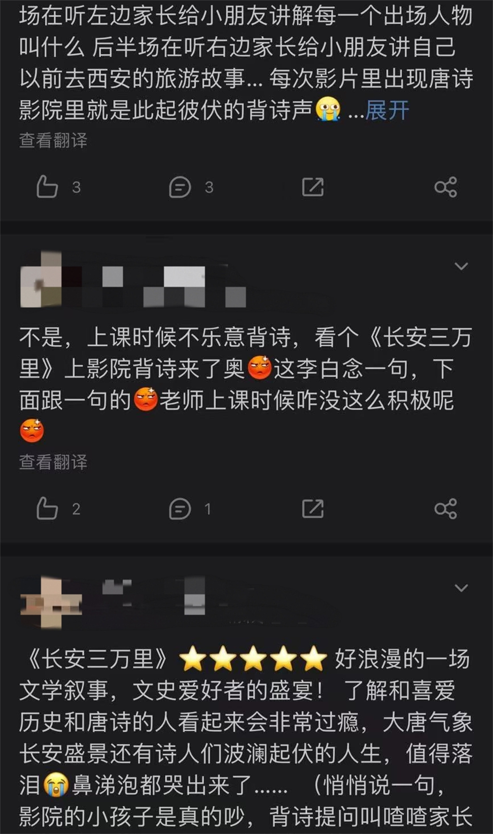 而《长安三万里》的片方在接受产业媒体采访时表示,《长安三万里》想做的是覆盖到更多或许还没有动画观影习惯的“受众”。“好比说一些四五十岁的中年人,平时可能不会去看动画电影。”影片168分钟的时长,对于孩子来说,本身也存在了一些让注意力集中的障碍。因此,网络上也有部分声音认为,这并不是一部拍给小孩子看的电影,除了片中密集的文史知识点和绚丽的特效画面,诗词字面意思下所表达的深意,也许需要更多阅历才能品出其中的伤感或通达。也正是因为其中许多段落需要“细品”,一些希望更沉浸式进入影片意境的成年观众才会觉得现场孩子们的背诵成为了一种打扰。