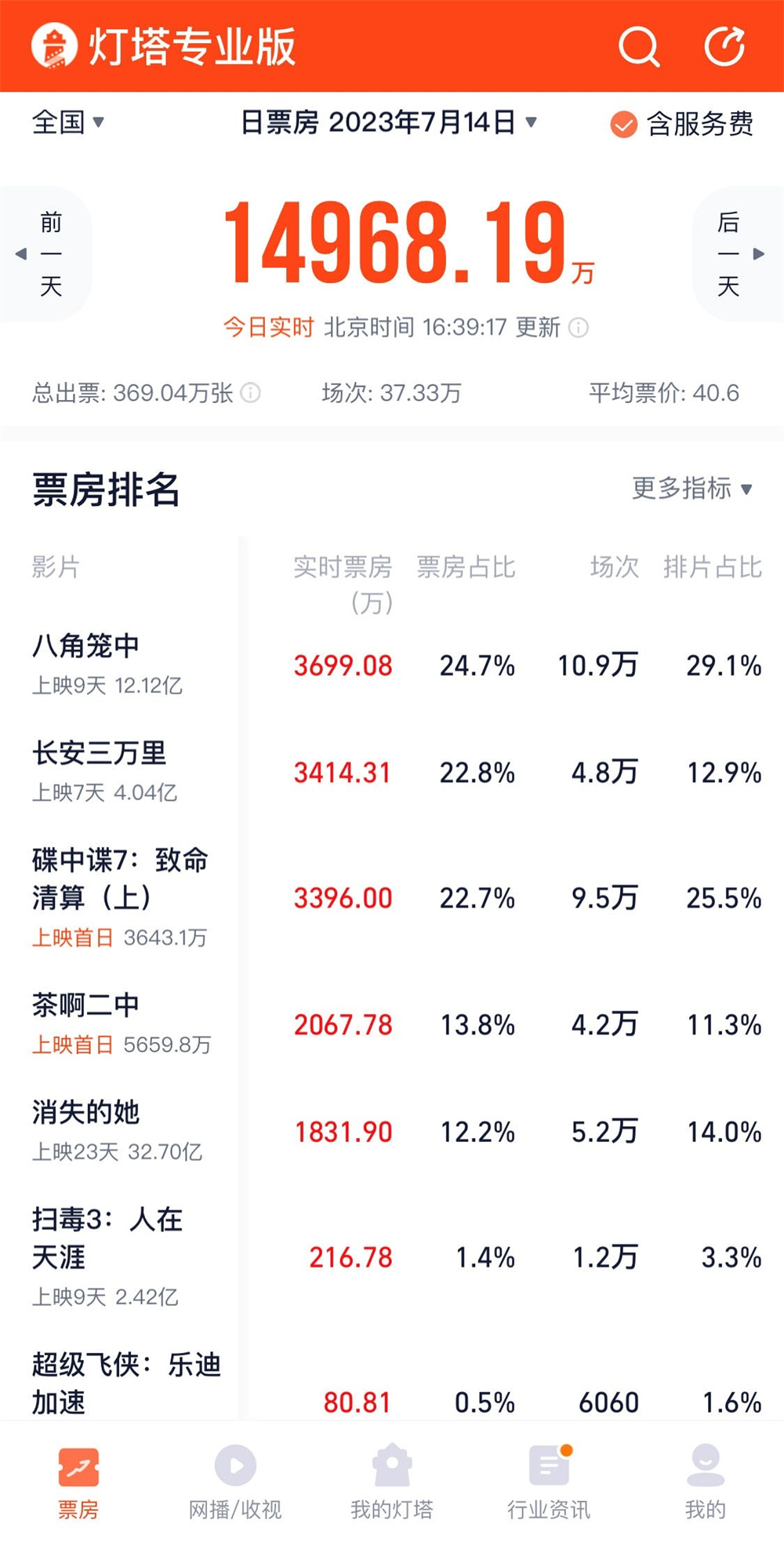 截至记者发稿,《长安三万里》的票房已突破4亿元,不足13%的排片相比近30%的《八角笼中》和25.5%的《碟中谍7》并不占优,但该片以14.3%的上座率成为同档期场均人次最高的影片。
